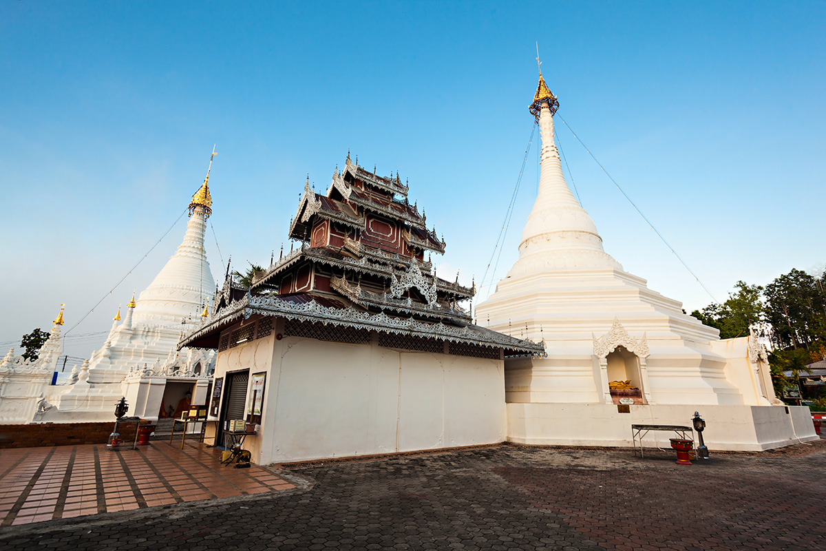 Phra That Doi Kong Mu regarded as a sacred place The valuable address of the people of Mae Hong Son Province for a long time. Located on Doi Kong Mu (Can drive up) There are important religious places, including big white pagoda looks like a Mon chedi with octagonal base Decorate the stucco pattern looks beautiful.